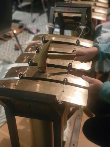 Le gamelan est composé principalement d’instruments en métal que l’on frappe avec des maillets. Ce sont donc des instruments à PERCUSSIONS.